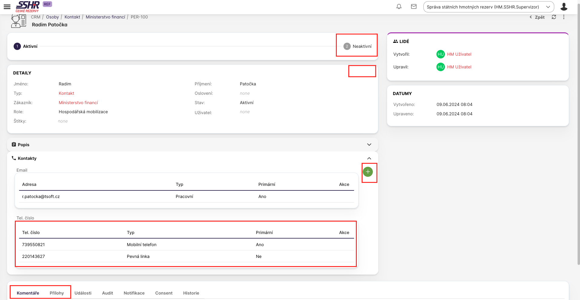 kliknutím na Neaktivní může tuto osobu zneaktivnit, v přehledu odpovědných osob se zobrazuje přeškrtnutě. Nebo naopak může tuto odpovědnou osobu zaktivnit.