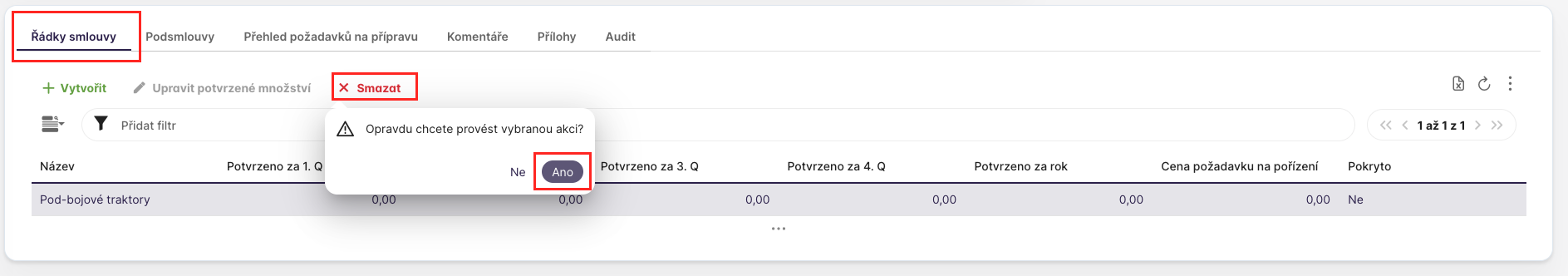 Uživatel s rolí a přiřazeným ÚSÚ nebo dodavatelem, který může vytvořit řádek smlouvy, může na téže smlouvě také i smazat řádek smlouvy. Vybráním konkrétního řádku smlouvy a stistknutím tlačítka smazat je tento řádek smlouvy smazán.