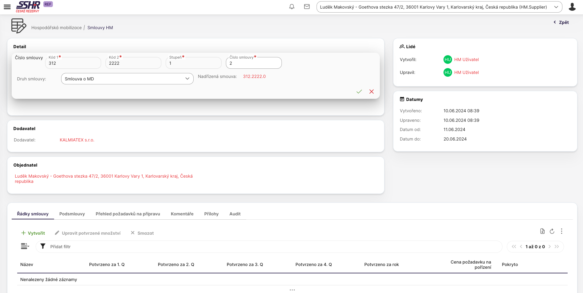 Na záložce Řádky smlouvy může uživatel vidět jednotlivé požadavky na MD přiřazené ke smlouvě. Smlouva může mít jeden nebo více řádků smlouvy. Zároveň na řádku smlouvy uživatel vidí i potvrzené množství za jednotlivá čtvrtletí dodavatelem.