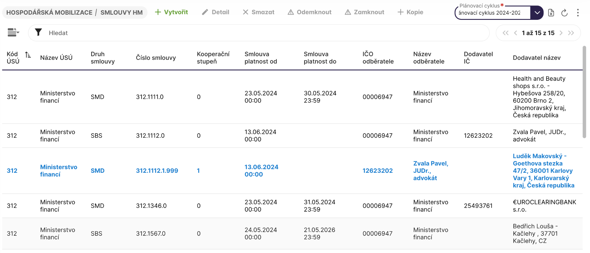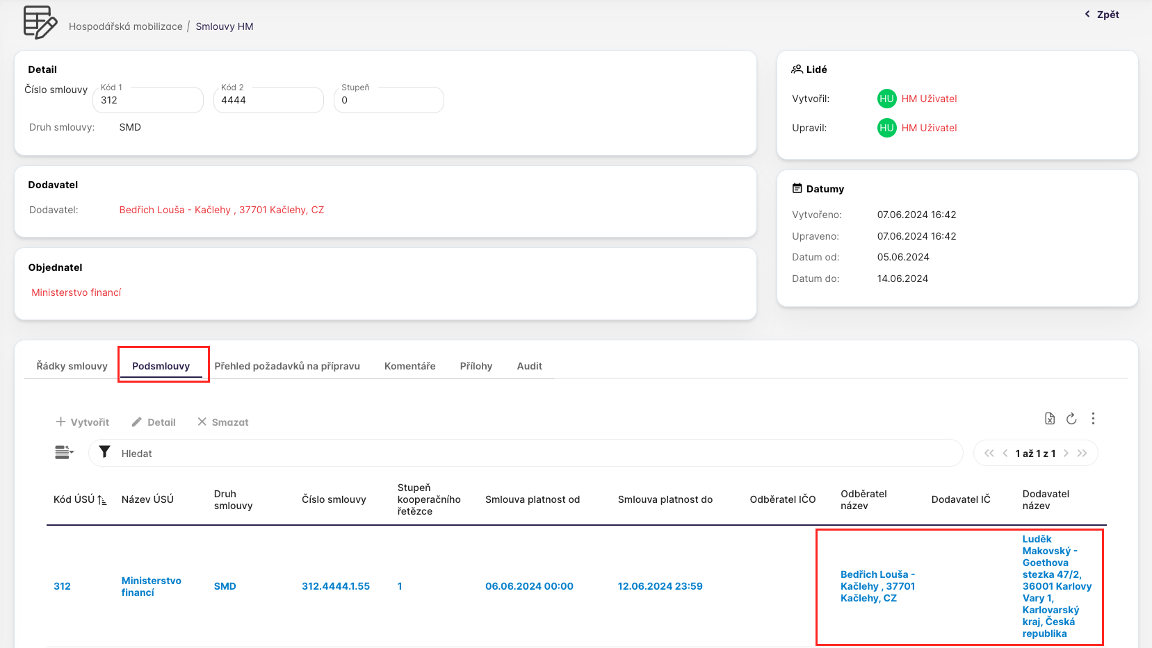 Dále v přehledu podsmluv je u každého záznamu zobrazena identifikace objednatele a dodavatele.