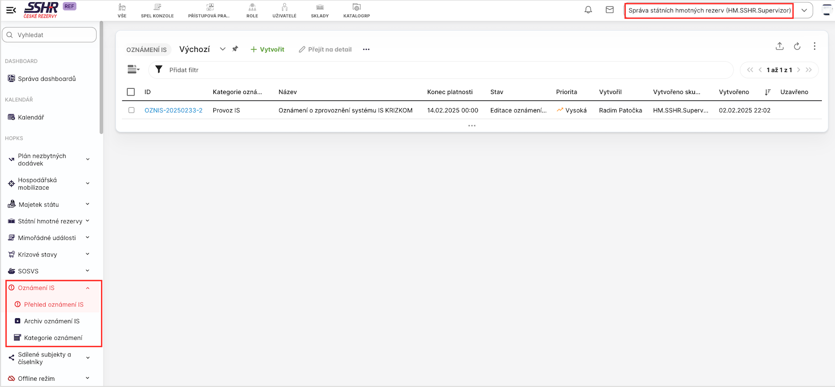 Každý uživatel KRIZKOM26 má přístup do oznámení IS - modulu Komunikace IS. Na levé straně v navigačním menu zvolí možnost Oznámení IS a může si zobrazit přehled oznámení. Přehled obsahuje jen ta oznámení, která vytvořil uživatel (nebo jeho uživatelská skupina, zde HM.SSHR.Supervizor) nebo byly určeny jeho organizaci (zde SSHR). V případě cizích oznámení zároveň platí, že jsou viditelné pouze ty, které jsou v stavu Zveřejněné oznámení.