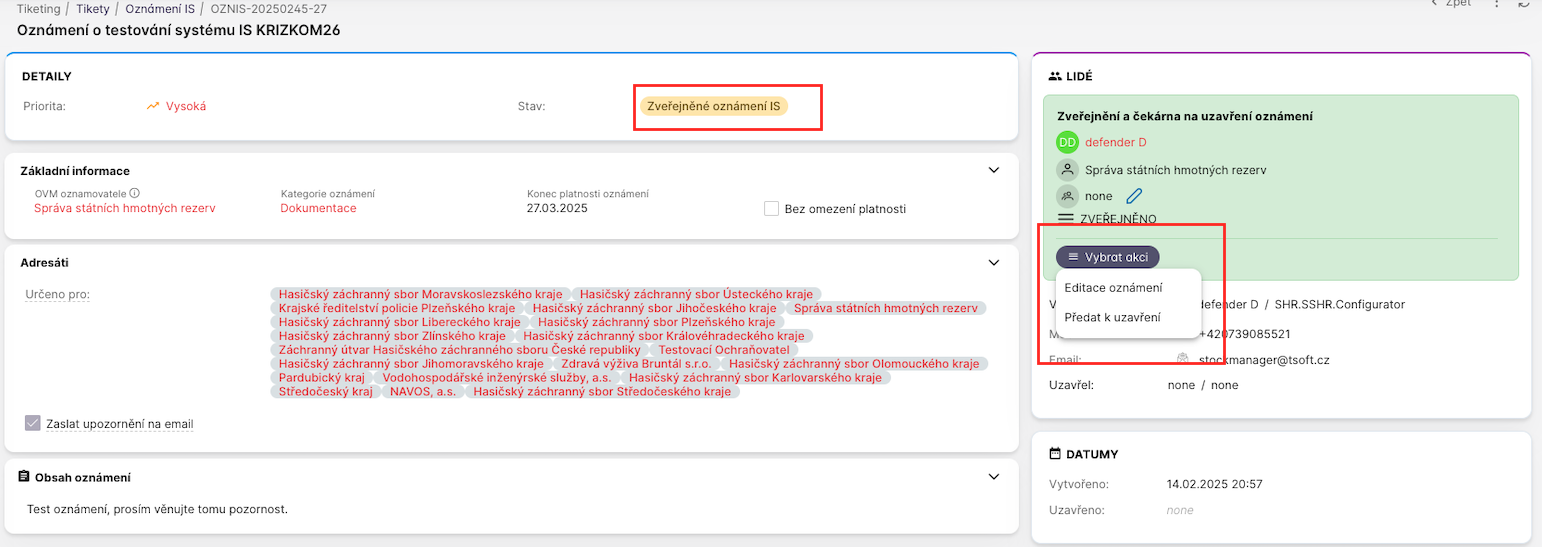 Po ukončení editace a zvolení možnosti Odeslat jsou zaslány notifikace a systém čeká na zvolené datum konce platnosti. Uživatel aktuálně nemůže editovat oznámení, ale když převezme task a klikne na tlačítko Vybrat akci, tak může zvolit dvě možnost: