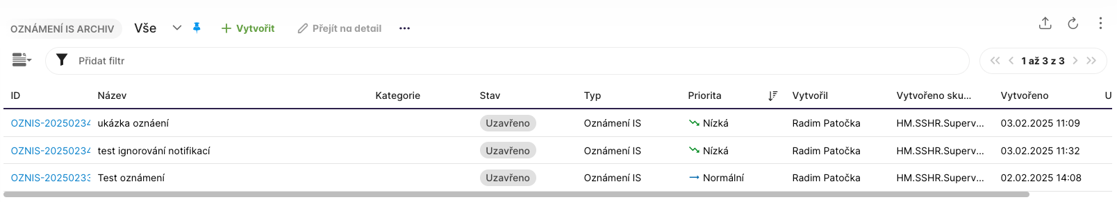 V navigačním menu je možné se dostat na Archiv oznámení IS, kde uživatel může vidět všechna oznámení, která jsou určena jeho organizaci nebo je sám vytvořil (či jeho uživatelská skupina) a zároveň jsou tato uzavřena. Typicky uplynul čas, do kdy mají být zveřejněny.