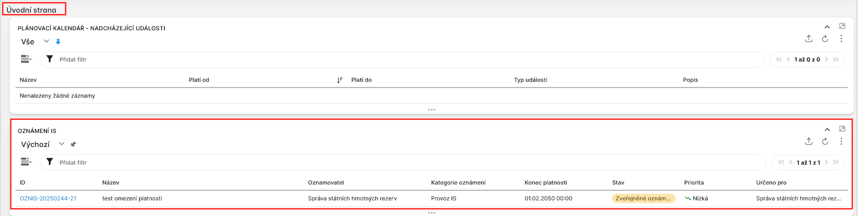 V dashboardu úvodní strana, na kterou se dostane automaticky každý uživatel po přihlášení, se zobrazí přehled oznámení podle pravidel v kapitole 2.1.