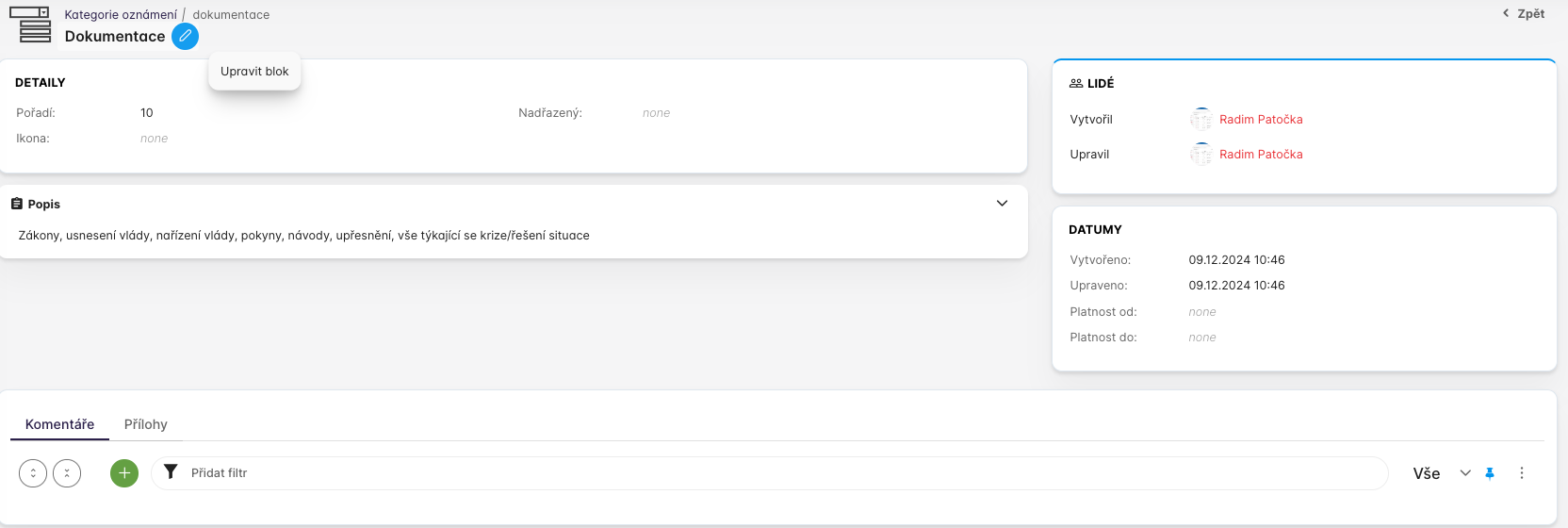 Kliknutím na jeden řádek kategorie oznámení a stisknutím tlačítka Přejít na detail nebo dojklikem na řádek kategorie oznámení se uživatel dostane do editačního módu. Je možné měnit kód, Název, Pořadí, popř. Nadřízenou kategorii. Je též možné uvést Popis kategorie, přidat komentář a přílohu.