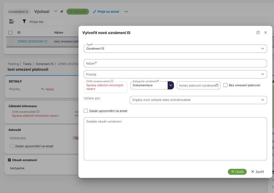Předat k uzavření - tato možnost slouží pro zrychlení ukončení, tj. systém nebude čekat, až uběhne doba konce platnosti a oznámení je uzavřeno.