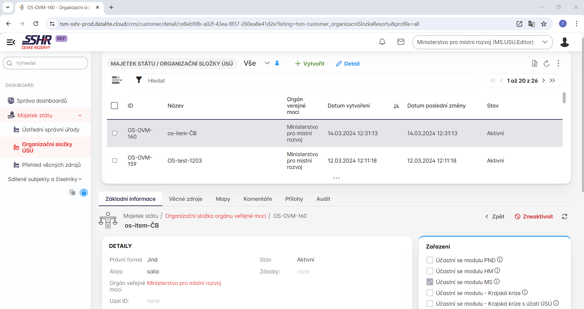 Pro aktivování/zneaktivnění organizační složky je nutné být přihlášen pod uživatelem s rolí MS.USU.Editor