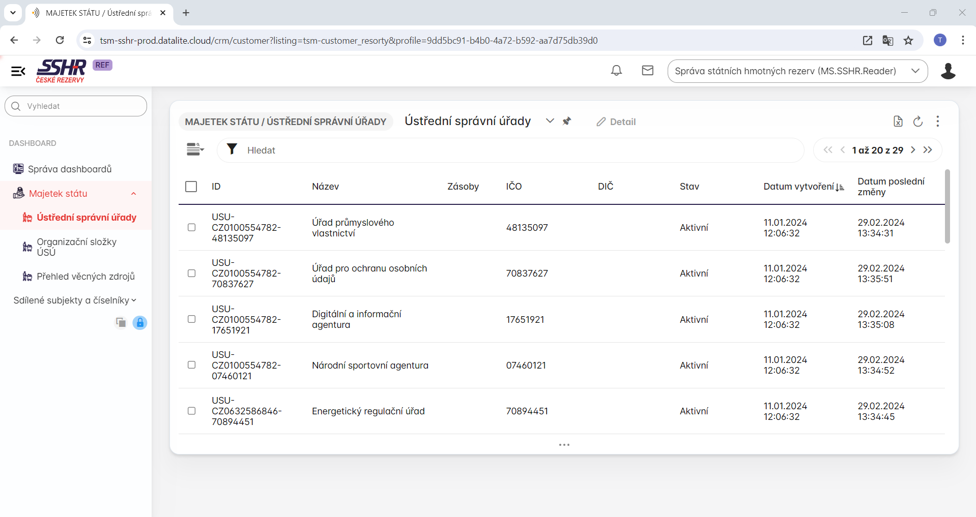 Přehled Ústřední správní úřady se nachází v modulu Majetek státu a slouží k zobrazení a správě ÚSÚ přiřazených k uživateli s příslušnou rolí. Pokud je uživateli přiřazen pouze jeden ÚSÚ, uvidí v přehledu pouze tento jeden přiřazený ÚSÚ. Zakládání nových ÚSÚ může pouze uživatel s rolí administrátor nebo Správce číselníků.