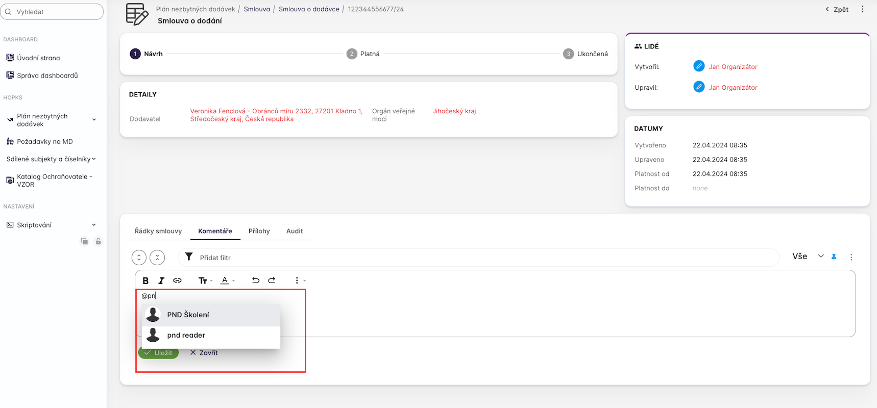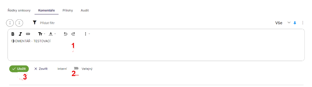 Komentář se přidává k detailu záznamu, např. k detailu Smlouvy. Slouží pro uložení poznámky a může tak učinit každý uživatel, který má k tomu oprávnění.