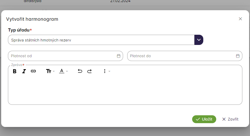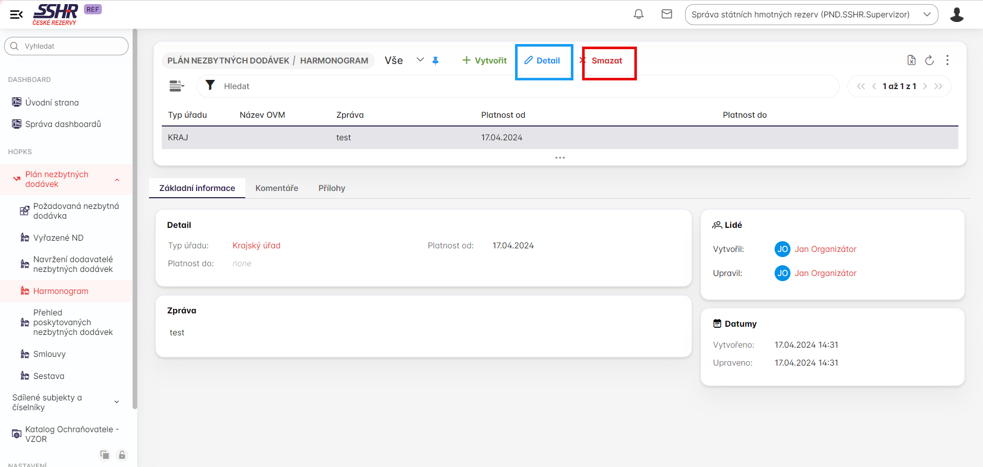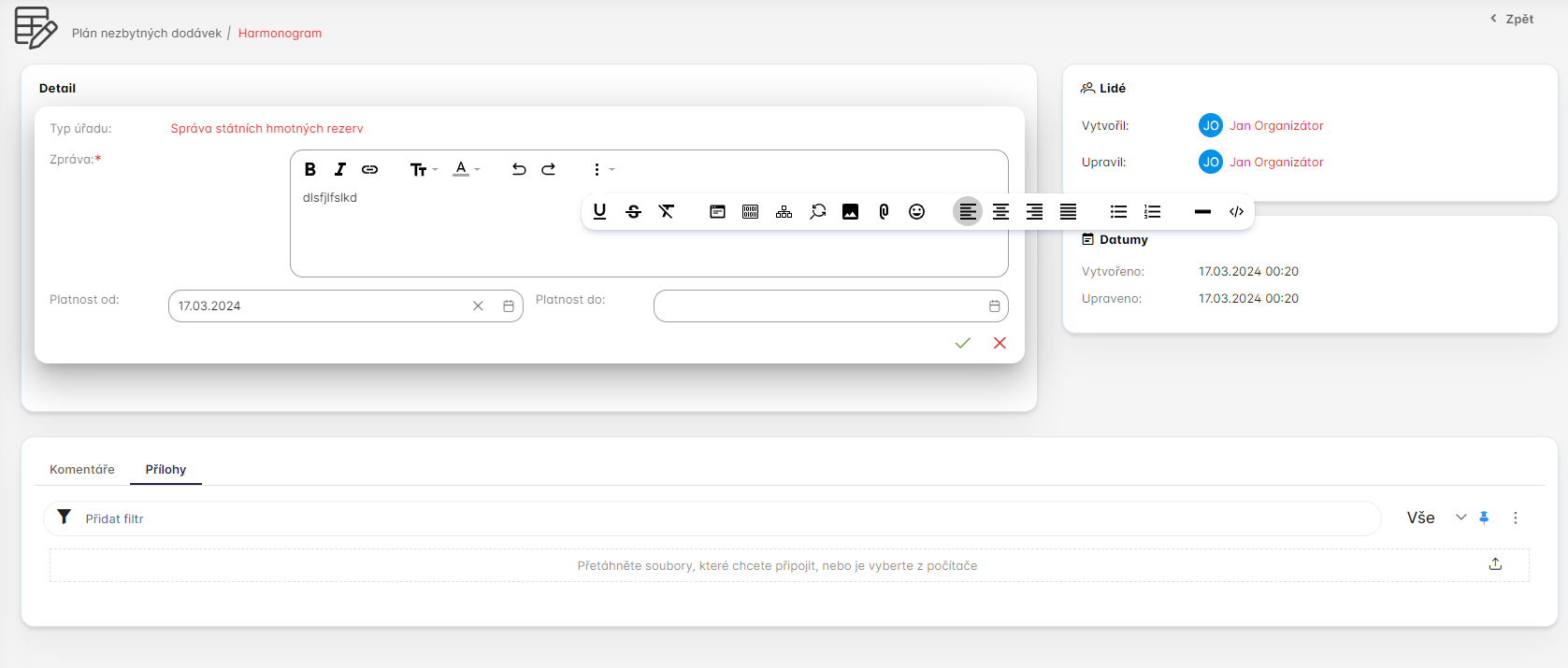 Kliknutí na tlačítko Detail uživatel otervře zvolený harmonogram a můžeme do něj přidat další přílohy, případně upravit datum od a do. Musí mít však správnou roli s oprávnění pro editaci harmonogramu a musí mít i přiřazený správný orgán veřejné moci.