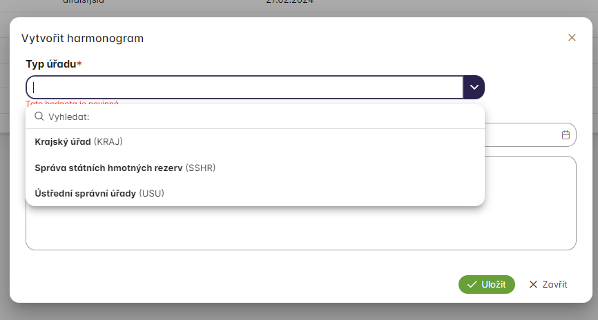 V rozbalovacím poli Typ úřadu vybereme požadovanou hodnotu. Tato hodnota určuje, jakému typu orgánu veřejné moci je harmonogram (a jeho zpráva) určen.