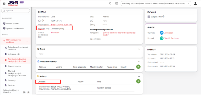 Kliknutím na tlačítko „Uložit" se zobrazí detail nově navrhovaného dodavatele a zobrazí se v přehledu navržených dodavatelů. Po přidání dodavatele do tabulky je ve sloupci „Stav" hodnota „Návrh".