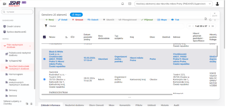 Kliknutím na „Navržení dodavatelé nezbytných dodávek" v menu se zobrazí přehled již navržených dodavatelů na požadované ND.