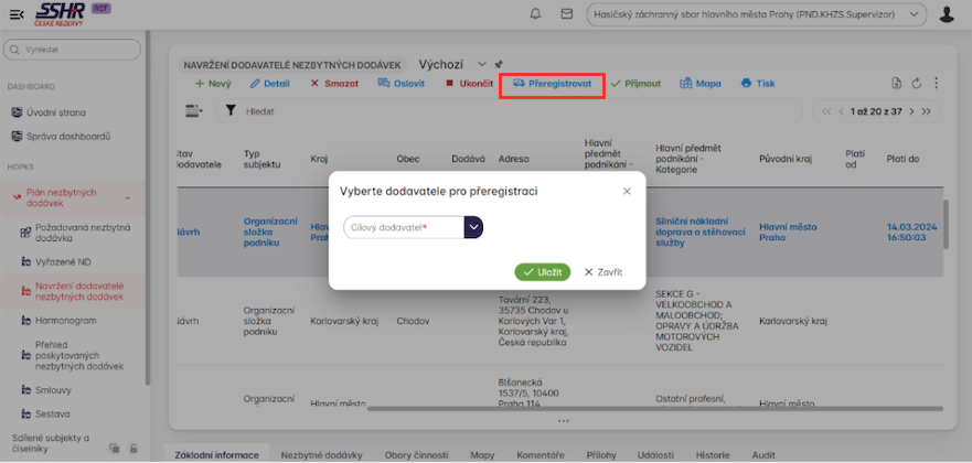 Vybráním příslušného dodavatele a kliknutím na tlačítko „Uložit" se převedou data o dodávání z neplatného dodavatele na dodavatele nového.