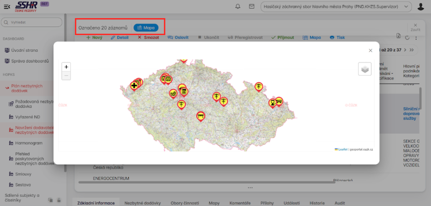 Kliknutím na zaškrtávací tlačítko vlevo od sloupce „ID" vybere všechny záznamy navržených dodavatelů v zobrazeném přehledu, tlačítka nad přehledem jsou překryta lištou „Mapa". Pokud uživatel ve výběru vlevo od sloupce ID vybere pouze některé navržené dodavatele, budou na mapě zobrazeni jen tito vybraní navržení dodavatelé.