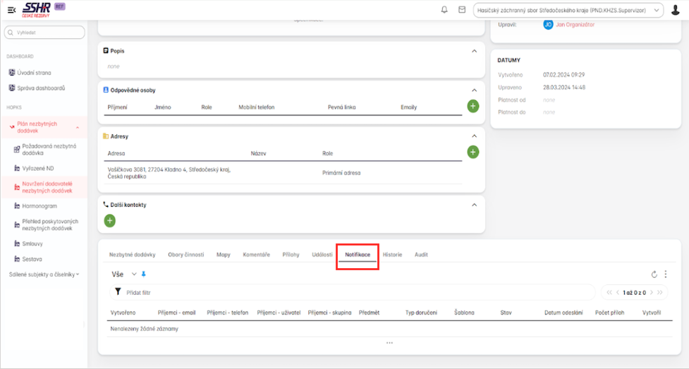 Při úspěšném "Oslovení" dodavatele systém vytvoří "Notifikaci", kterou je možné zobrazit na konci stránky v detailu dodavatele na kartě "Notifikace"