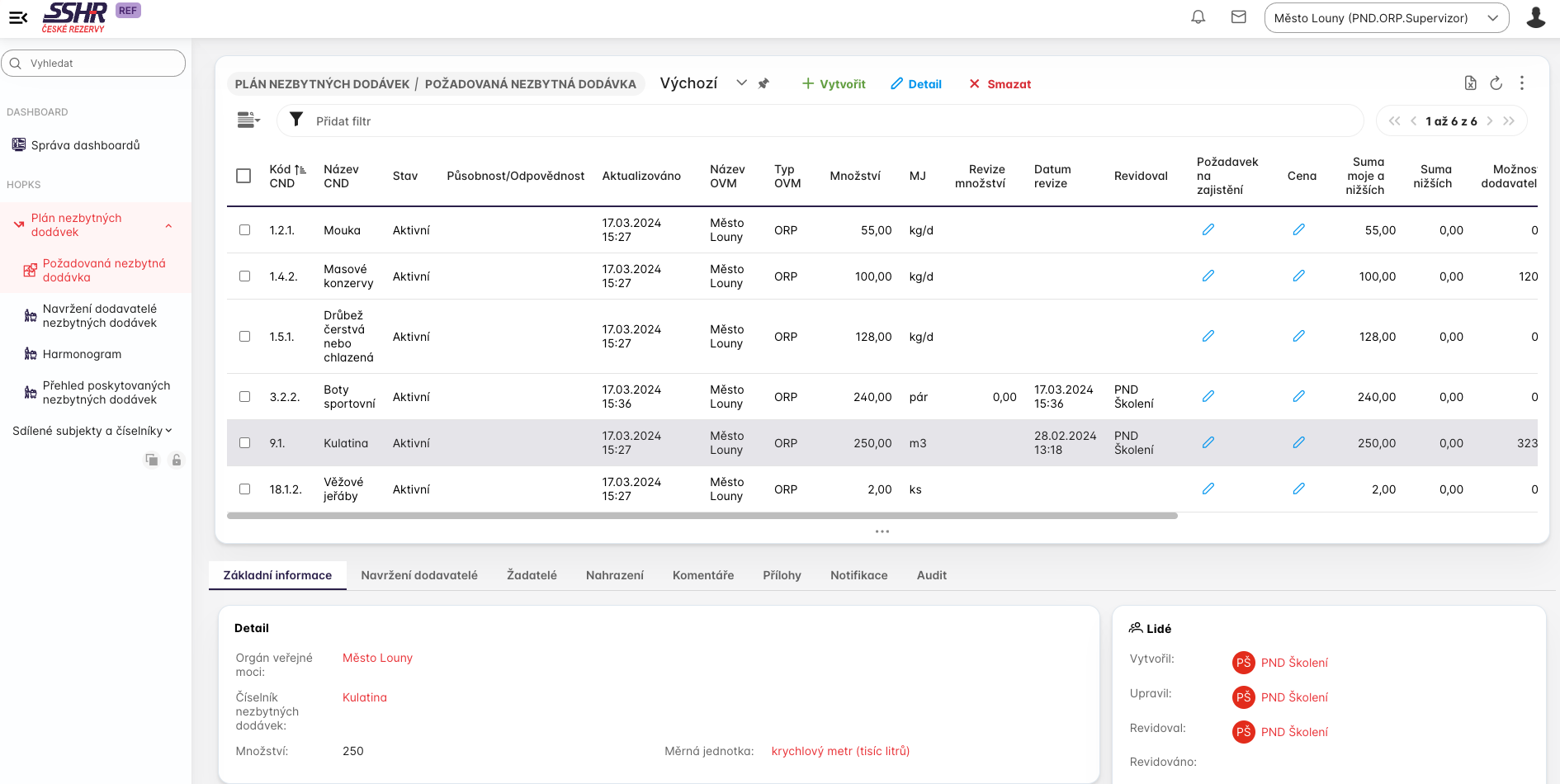 Revize množství (vč. Datum revize a Revidoval): Uživatel s rolí PND.KU.Supervizor může při zobrazení nižší, revidovat množství požadované nezbytné dodávky ORP. Pokud reviduje na hodnotu 0, je požadovaná nezbytná dodávka vyřazena.