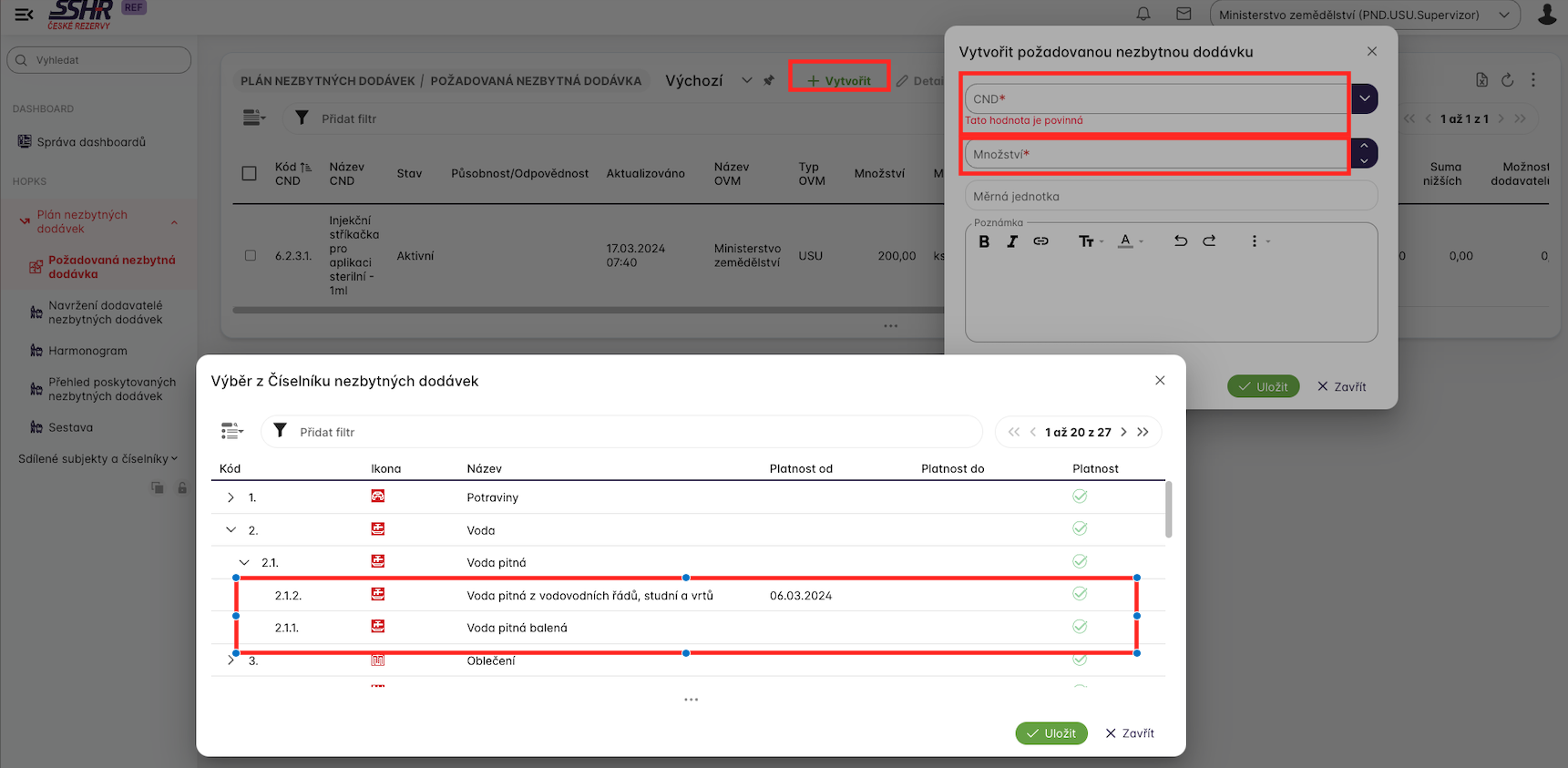 Požadavek na zajištění a cena - OVM může v případě, že není schopen zajistit poskytnutí dodávky, označit množství a případně cenu položky CND jako požadavek na zajištění.