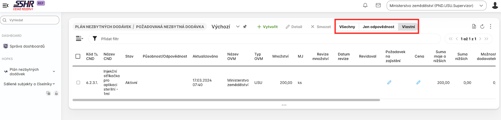 Uživatel má možnost přepínat mezi zobrazením "Vlastní", "Nižší" a "Vyšší", jako výchozí je nastaveno zobrazení "Vlastní", které ukazuje přehled požadovaných nezbytných dodávek přihlášeného uživatele (s přiřazeným OVM).