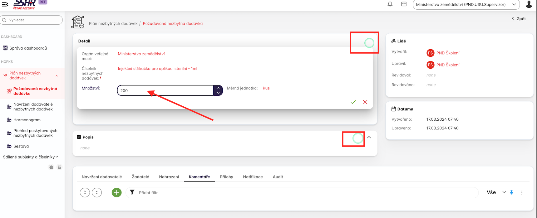 Uživatel v roli Supervizor může editovat jím vytvořenou požadovanou nezbytnou dodávku.