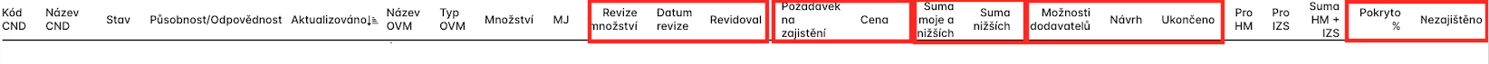 2.1.3 Přehled některých sloupců seznamu požadovaných nezbytných dodávek