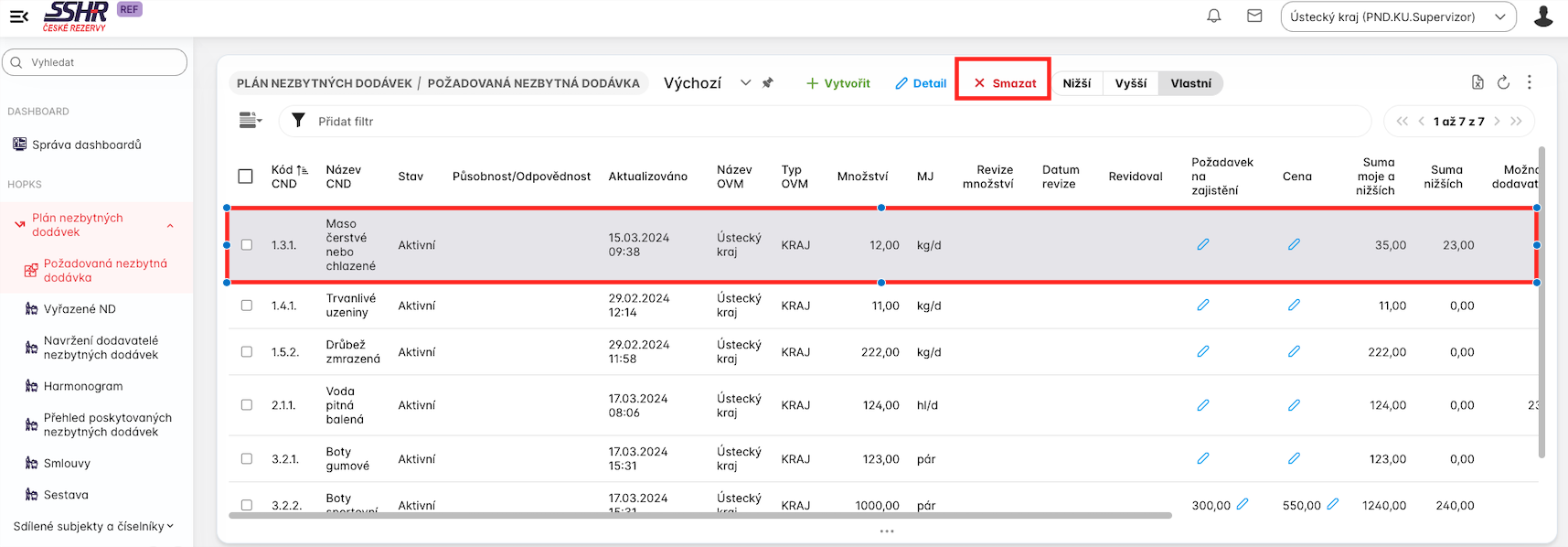 Uživatel Supervizor, může smazat požadovanou nezbytnou dodávku, pouze však tu, kterou vytvořil uživatel jeho OVM. Uživatel označí v přehledu požadovaných ND položku, kterou hodlá smazat a klikne na tlačítko X Smazat.