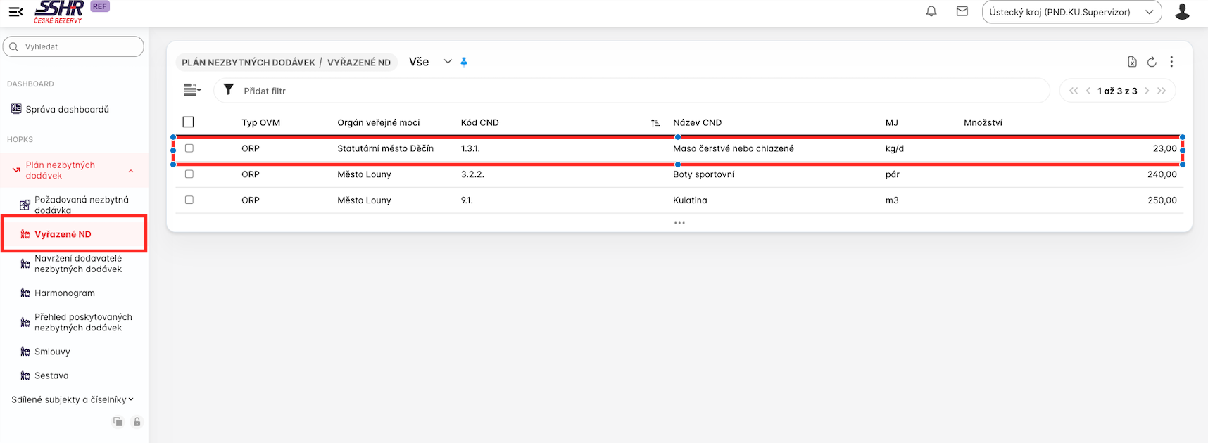 Pokud uživatel v roli PND.KU.Supervizor na pohledu "Nižší" reviduje množství požadované ND na hodnotu "0", vyřadí tuto z plánu. Poždodovan ND je odstraněna ze seznamu a přibude společně s údaji o vyřazení v seznamu Vyřazené nezbytné dodávky.