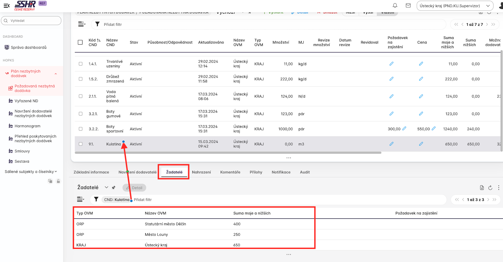 Uživatel podle zařazení do uživatelské skupiny (tedy i role PND.) a přiřazeného orgánu veřejné moci vidí přehled požadovaných nezbytných dodávek.