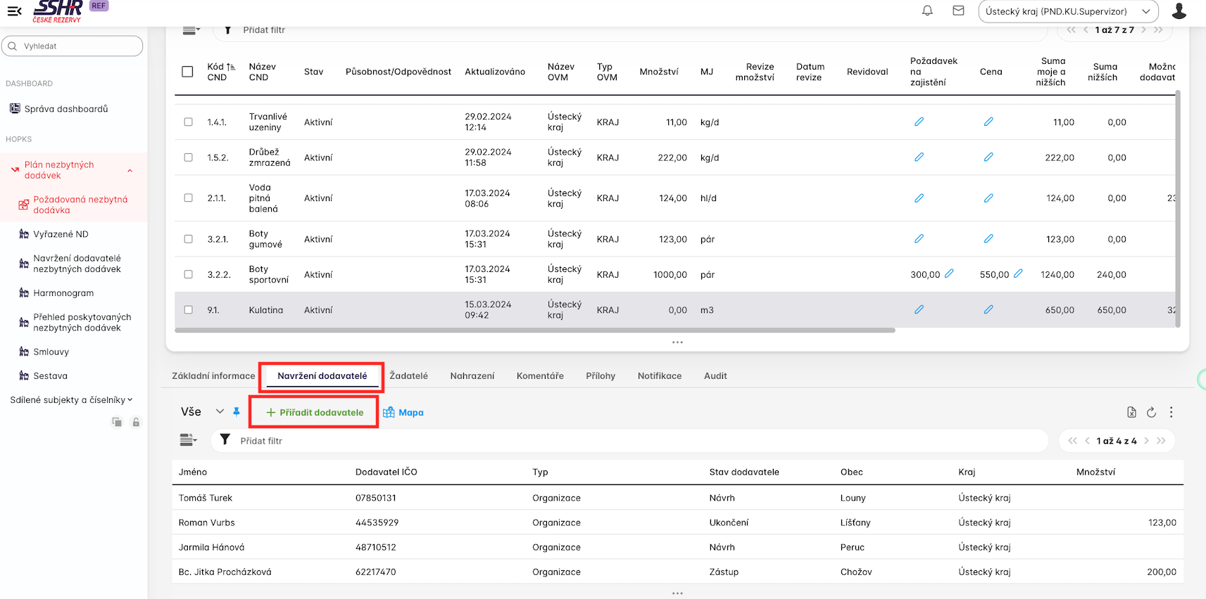 Uživatel v roli Supervizor může přidělovat další navržené dodavatele k této požadované nezbytné dodávce, vždy však ze seznamu navržených dodavatelů nezbytných dodávek k nimž je územně příslušný..