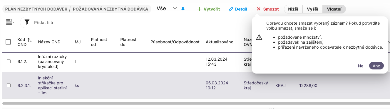 Uživateli se zobrazí info hláška, které všechny záznamy vztahující se k vybrané požadované nezbytné dodávky se potvrzením smažou.