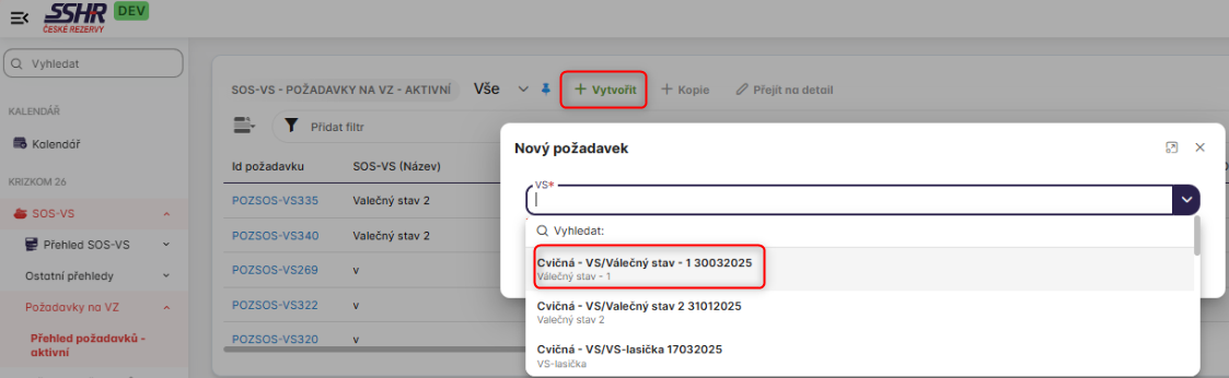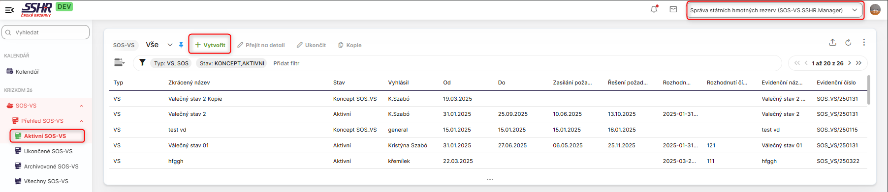 V modulu SOS-VS, komponentě Přehled SOS-VS, podkomponeně Aktivní SOS-VS se přihlášenému uživateli v roli SOS-VS.SSHR.Manager zobrazí nad listingem tlačítko Vytvořit.