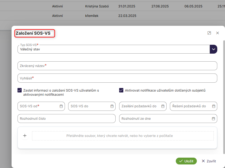 Po kliknutí na tlačítko Ukončit se zobrazí formulář Ukončení SOS-VS