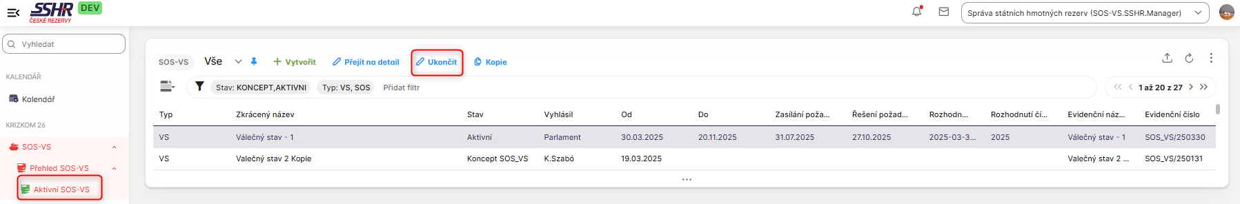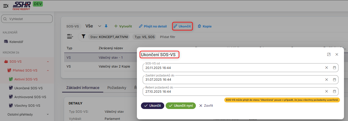 V modulu SOS-VS, komponentě Přehled SOS-VS, podkomponeně Aktivní SOS-VS se přihlášenému uživateli v roli SOS-VS.SSHR.Manager zobrazí nad listingem tlačítko Ukončit.