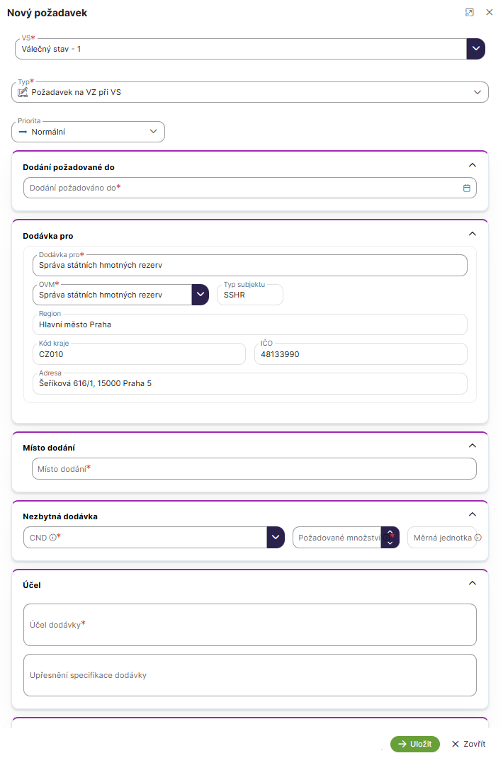 Po výběru události se načte formulář pro založení požadavku.