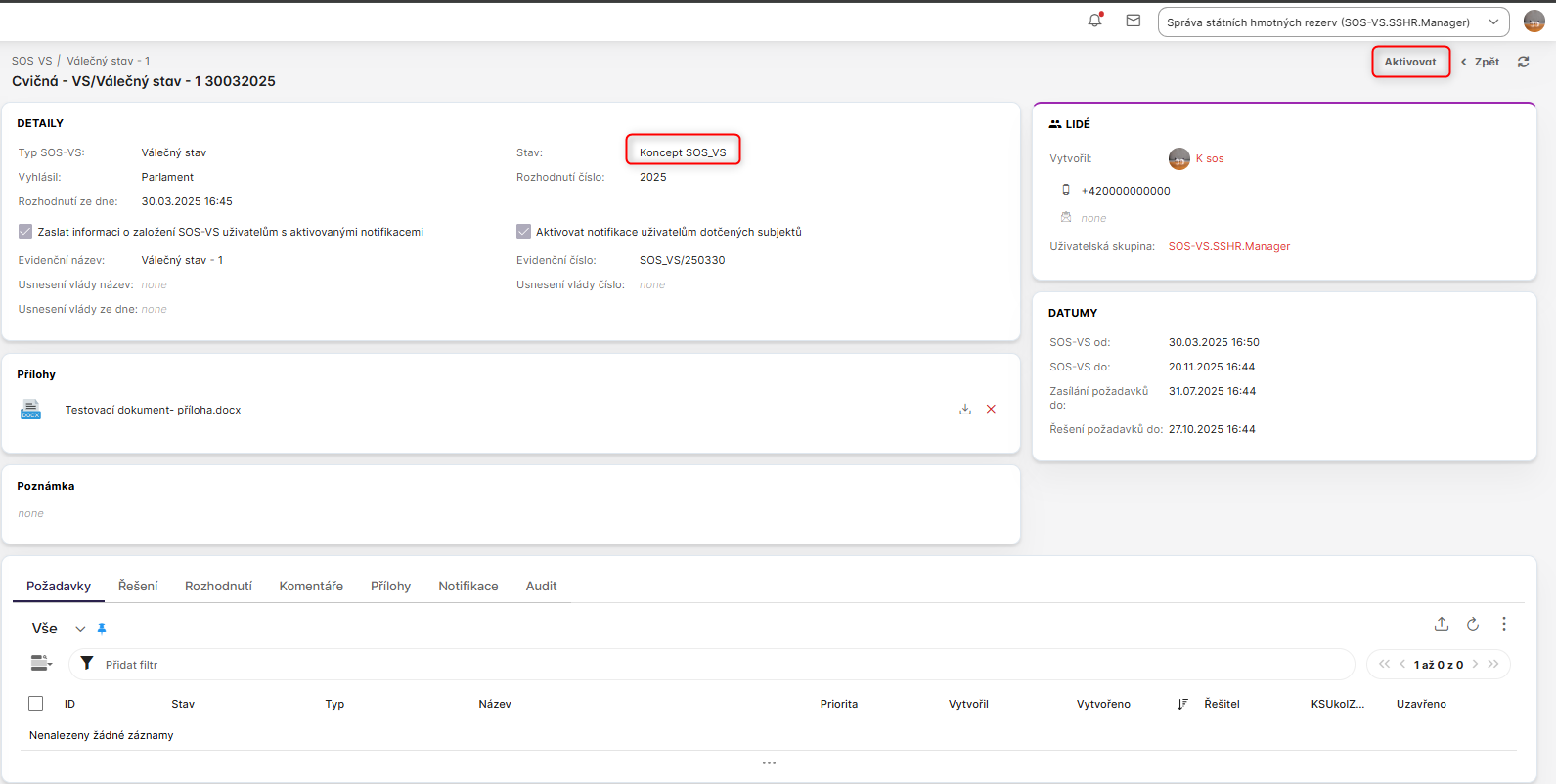 Pouze uživatel v roli SOS-VS.SSHR.Manager smí událost ve stavu Koncept SOS_VS aktivovat tlačítkem Aktivovat v pravém horním rohu obrazovky.