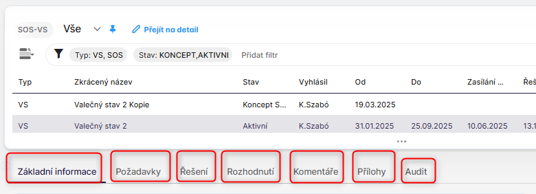 Komponenta Přehled SOS-VS obsahuje listingy SOS-VS událostí, které se liší nejen stavem, ale i možností editace v kontextu role přihlášeného uživatele.
