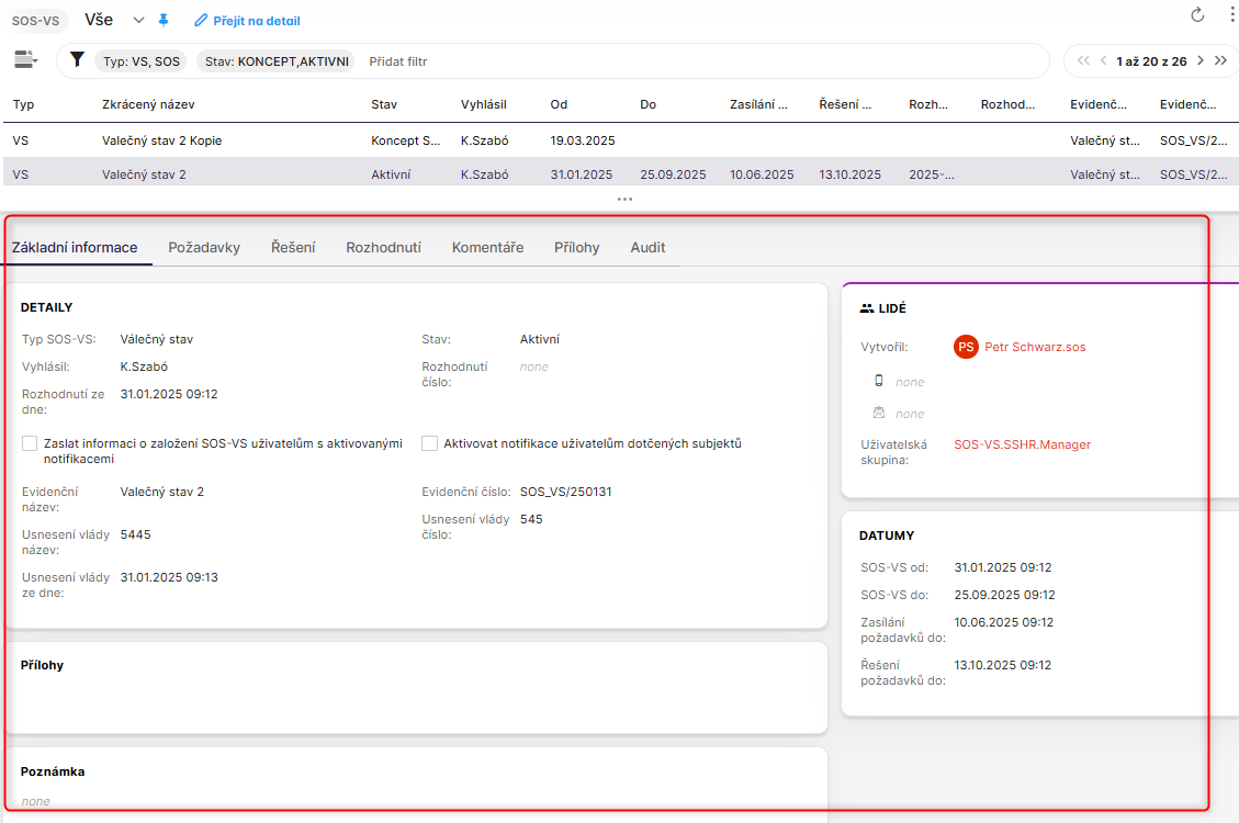 Označením jednoho záznamu v listingu (pole se záznamem je zašedlé), se pod listingem zobrazí jeho detail (základní přehled, sekce Datumy, sekce Lidé, Přílohy, Poznámky).