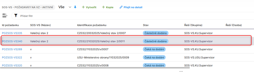 Jednotlivé požadavky, které byly založeny pod konkrétní SOS-VS události se zobrazují v komponentě Požadavky na VZ. V podkomponentě Přehled požadavků- uzavřené se nachází seznam všech požadavků ve stavu Požadavek dokončen nebo Požadavek zamítnut. Požadavky ve všech ostatních stavech jsou v Přehledu požadavků- aktivní.