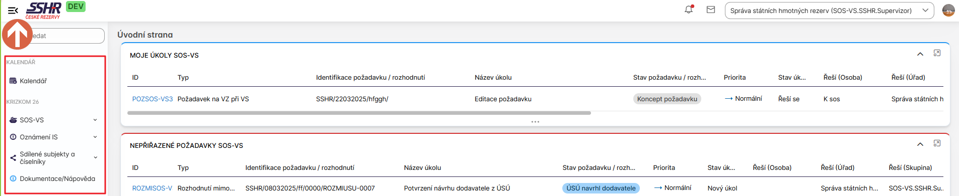 Na příkladu je zobrazena úvodní stránka pro uživatele, který je přihlášený pod rolí SOS-VS.SSHR.