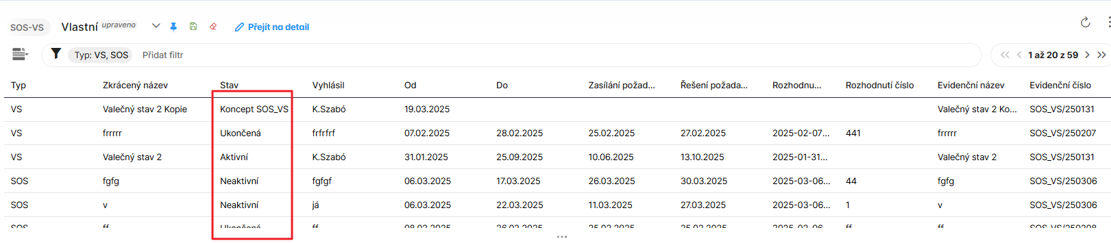 Na příkladu se zobrazují všechny SOS-VS události, ve stavu aktivní nebo koncept, v kontextu přihlášeného uživatele v konkrétní roli (zde SOS-VS.SSHR.SUPERVIZOR).