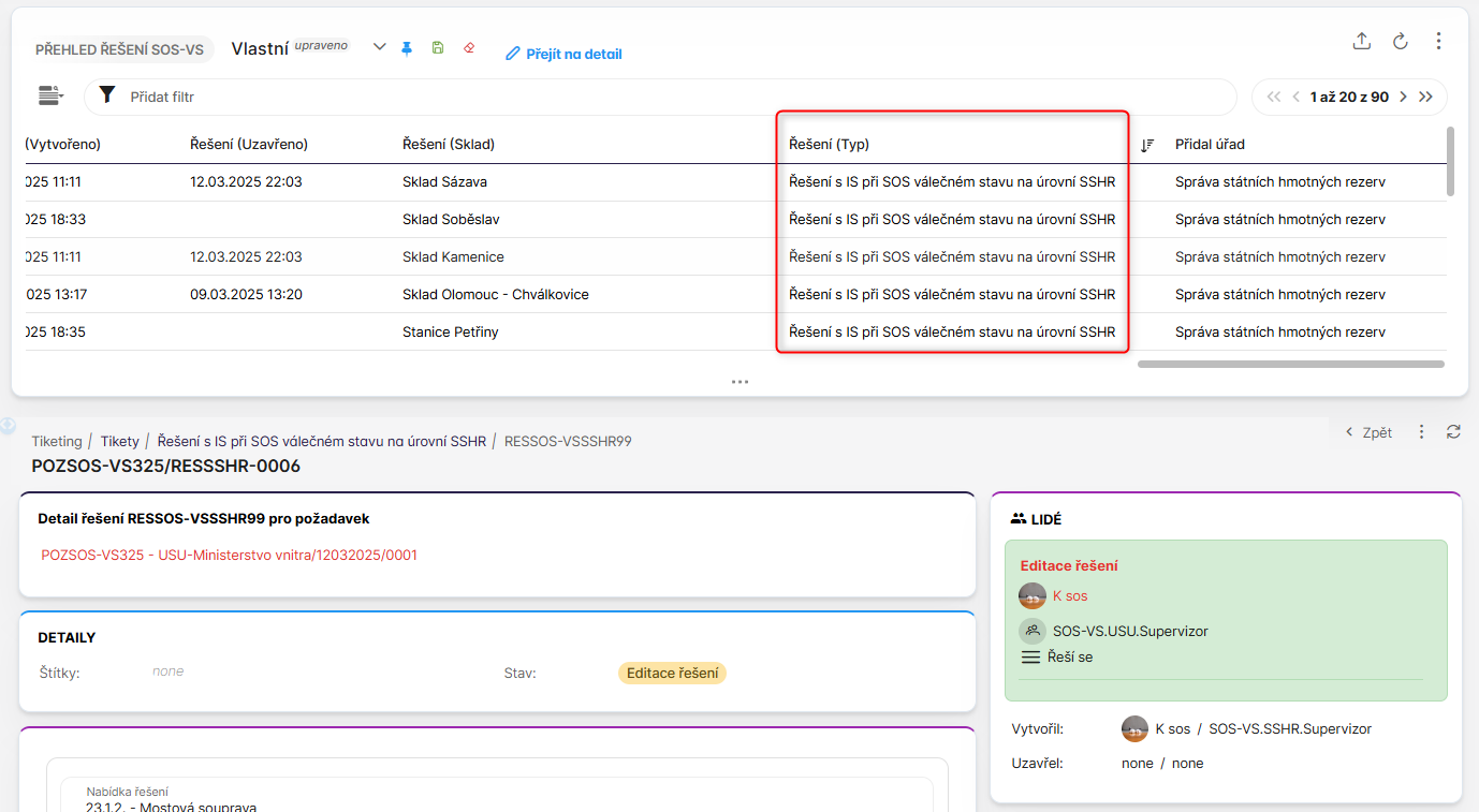 Zobrazí se listing se všemi řešeními z požadavků, které jsou dostupné přihlášenému uživateli v konkrétní roli. Listing obsahuje informace ke konkrétnímu řešení, k požadavku, pod kterým bylo vytvořeno a SOS-VS události, které se týká.