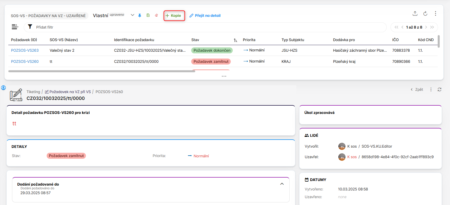 I z těchto požadavků lze, podle role přihlášeného uživatele, vytvořit kopii pomocí tlačítka Kopie.