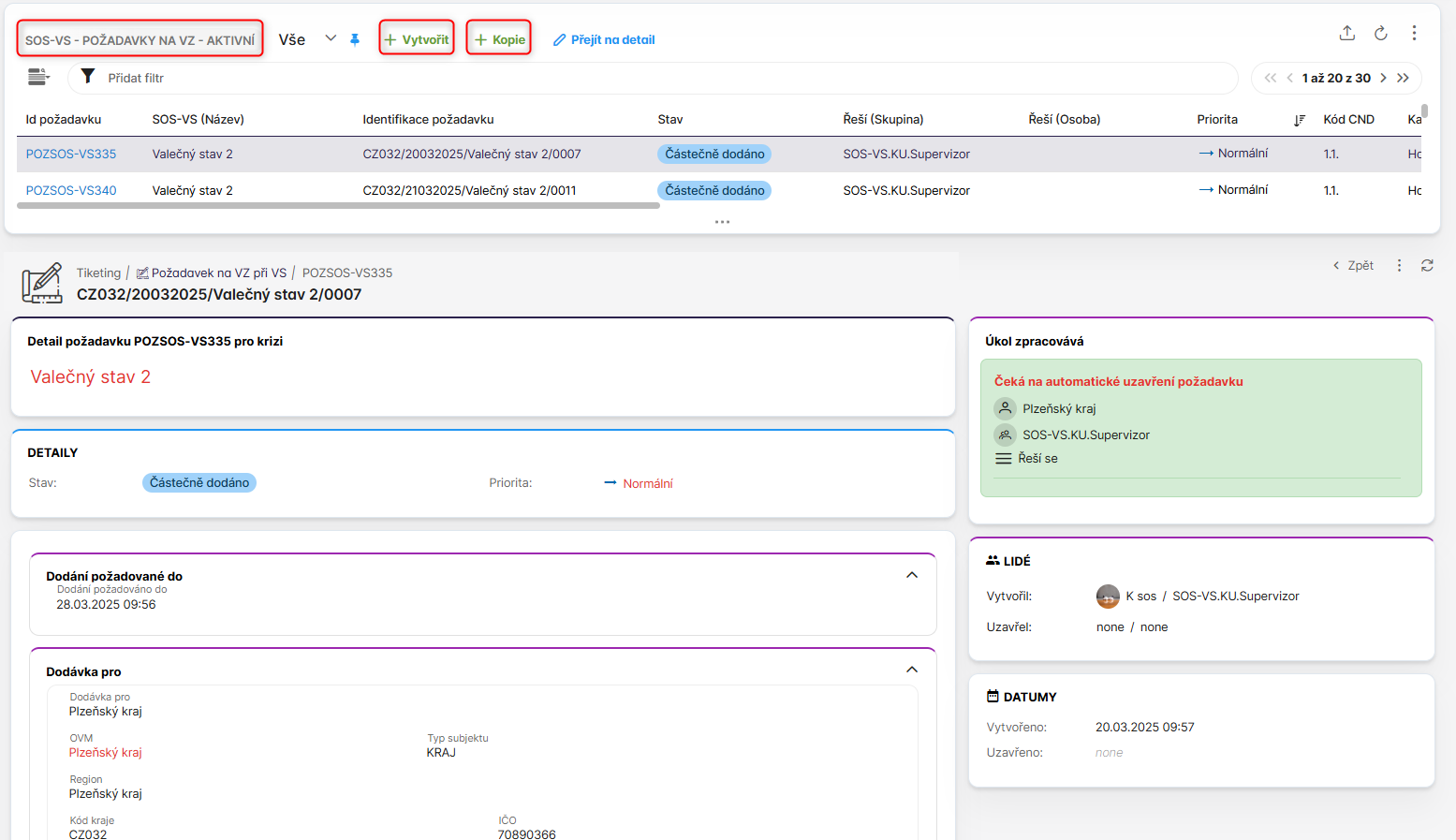 Pokud je přihlášený uživatel s rolí např. SOS-VS.SSHR.Supervizor, zobrazí se nad listingem událostí tlačítka pro vytvoření požadavku a pro vytvoření kopie zvoleného požadavku.